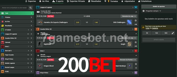 O 200Bet oferece uma grande seleção de opções de apostas em e-sports com probabilidades competitivas
